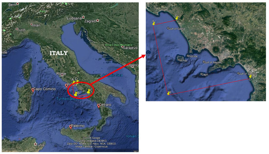 The test site is situated in the south part of Italy, see Figure 5 on the left, and covers a coastal area of about 90 km × 100 km (see Figure 5 on the right). More specifically, it starts in the south of the Gulf of Gaeta, includes the Gulf of Naples with the Ischia, Procida and Capri Islands, and part of the Gulf of Salerno.