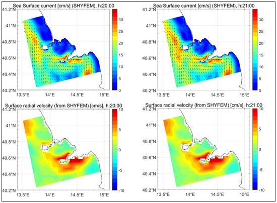 Ocean model results: surface current fields (upper panels) and intensities of the radial components (lower panels), computed for the 0 to 3 m surface water layer depth for the interested domain at the time 22/09/2010, 20:00 and 21:00 UTC.