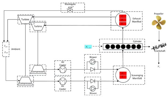 In consideration of the large size and weight of marine large scale two-stroke diesel engines as well as the substantial manpower and financial power required for carrying out experimental studies, various engine simulation techniques have been widely adopted for investigating engine performance, designing and testing the fault diagnosis algorithm, as well as developing the engine control system. Among these simulation models, 0-D models and mean value engine model (MVEM) are widely adopted by researchers mainly because of their fast running speed and satisfactory simulation accuracy. The difference between the 0-D model and MVEM lies in the modeling approach for the cylinder. For the 0-D model, the cylinder is assumed as an open thermodynamic system, where the working medium is uniformly distributed in it. By applying mass and energy conservation laws and incorporating several relevant sub-models, the in-cylinder pressure trace can be predicted. Furthermore, the 0-D model is also capable of predicting engine performance at varying settings (e.g., varying the start of injection timing, exhaust valve opening/closing timing, turbine area, etc.), which is a special advantage in comparison to the MVEM []. In the book published by Eriksson and Nielsen, the MVEM is defined as “Mean value engine models are models where the signals, parameters, and variables that are considered are averaged over one or several cycles” []. In this respect, the mass and energy flow through the cylinder is assumed continuous for the MVEM, and the engine average performance over one or several cycles can be obtained. Consequently, the MVEM is able to run much faster than the 0-D model, which is therefore very suitable for cases that require fast running speed, such as the simulation of engine transients for a long period. On the other hand, despite similar predictive accuracy can be achieved by the two models, the in-cylinder pressure trace cannot be predicted by the MVEM, which is its major limitation [,].
