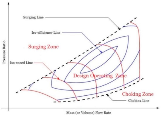 The working characteristic of a compressor is usually represented by the performance map as shown in Figure 2 with the mass (or volume) flow rate and pressure ratio as the horizontal and vertical coordinate, respectively.