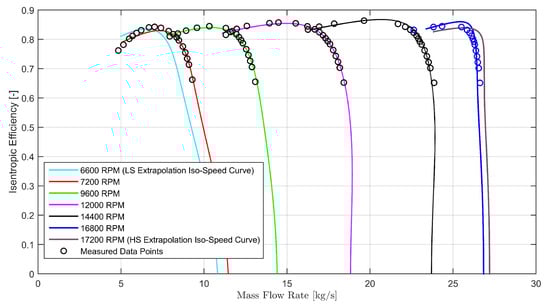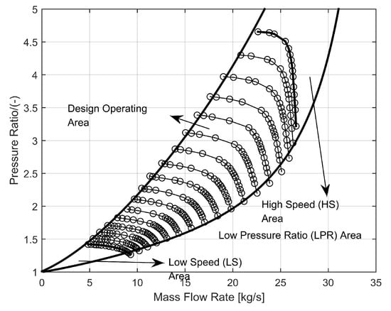 As shown in Figure 2, most of the compressor performance maps provided by the manufacturers only contain several discrete iso-speed and iso-efficiency curves in the design operating zone. However, for marine turbocharger compressor, its actual rotational speed may be lower than the lowest rotational speed presented in the performance map, or higher than the highest one; in addition, its pressure ratio may approach to unity under certain operating conditions, such as slow steaming, activation of the auxiliary blower and ship maneuvering []. Therefore, it is necessary for the developed compressor model to be capable of extrapolating to these off-design operating zones accurately and robustly. In addition, the developed compressor model is also required to accurately interpolate within the unknown areas between these discrete curves.