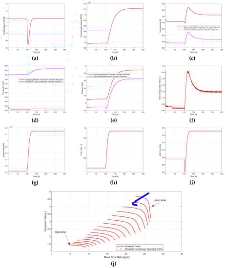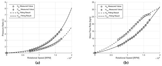 The changing trend of pressure ratio and mass flow rate with rotational speed on this curve can be represented by using Equations (17) and (18), respectively. As shown in Figure 4, the exponential function is capable of capturing the changing trend of with rotational speed accurately, which increases slowly under low rotational speed conditions and then rapidly under high rotational speed conditions; on the other hand, the changing trend of can be described satisfactorily with the arc-tangent function. It is also found that the changing trend of the pressure ratio and mass flow rate with rotational speed on the surging line can be captured satisfactorily by using Equations (17) and (18) as shown in Figure 4.