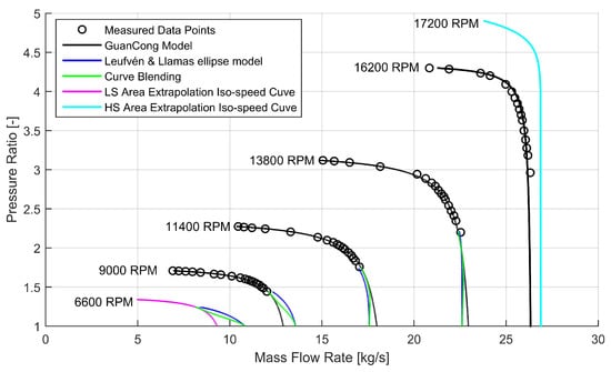 Figure 5 presents the blending results in the LPR area as well as two extrapolated iso-speed curves in the LS and HS area, respectively. As can be observed from this figure, the zonal compressor mass flow rate model is capable of not only predicting the available measured data points accurately but also extrapolating to the off-design operating area robustly and reasonably, which can effectively improve the steady and transient simulation accuracy of the MVEM developed in this paper. In addition, as also can be observed in Figure 5, under low and medium speed conditions, obvious difference exists between the blended curve and the original curve, indicating the deficiency of GuanCong model (or Karlson-II exponential model) in capturing the choking phenomenon; however, the difference gets less obvious with the increase in rotational speed and this is because that under high speed conditions, the measured data points available in the compressor map are very close to the choking point or have already choked, which can be estimated accurately by the GuanCong model (or Karlson-II exponential model), so the blending manipulation is unnecessary.