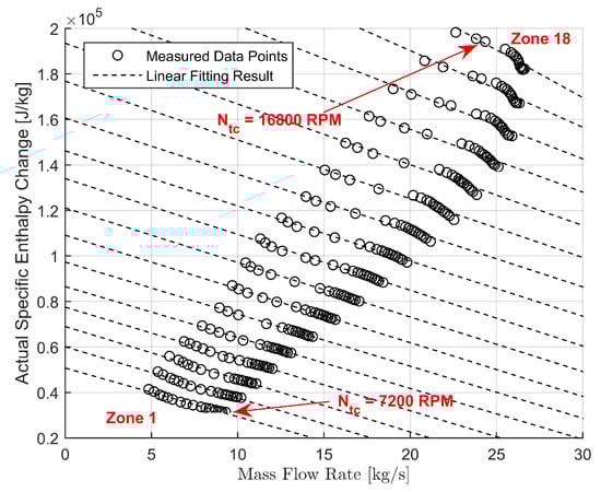 As can be observed from Figure 6, under high rotational speed conditions, distinguishable non-linear decreasing trend in the actual specific enthalpy change occurs as the mass flow rate gradually approaches to the choking point. As a result, the model’s predictive accuracy will be polluted if the model parameters are calibrated by using all the available measured data points in the compressor map. To solve this problem, a zonal modeling approach based on the Hadef model is proposed, which is referred to as “zonal isentropic efficiency model” in this paper. The basic idea is to divide the whole plane as shown in Figure 6 into several zones depending on the iso-speed curves available in the performance map, and then each zone is calibrated individually by using the measured data points at the current zone’s upper and lower iso-speed curve.
