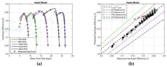 Figure 7 and Figure 8 presents the predictive results and the relative error distribution for the two isentropic efficiency models, respectively, whereas Table 2 presents respective error evaluation criteria results. Note that for depicting the predictive results clearly, only five iso-speed curves (7200, 9600, 12000, 14400, 16800 rpm) are presented in Figure 7a and Figure 8a. As can be observed from Figure 7a and Figure 8a, both models are capable of capturing the changing trend of the isentropic efficiency with mass flow rate. Nevertheless, it can be found from Figure 7b and Figure 8b as well as Table 2 that the predictive accuracy of the zonal isentropic efficiency model is better than the Hadef model with lower and and higher ; in addition, the relative errors of all the predictive results are within ±5%. The better predictive accuracy of the zonal isentropic efficiency model mainly benefits from the zonal modeling approach. With this approach, the working characteristic of the compressor within different speed range can be captured much more accurately.
