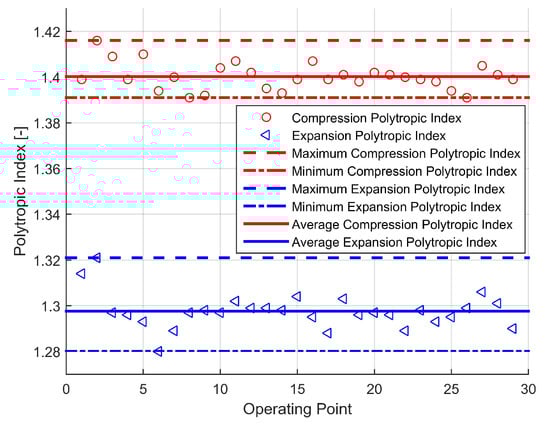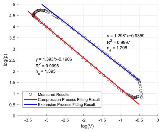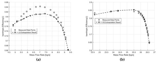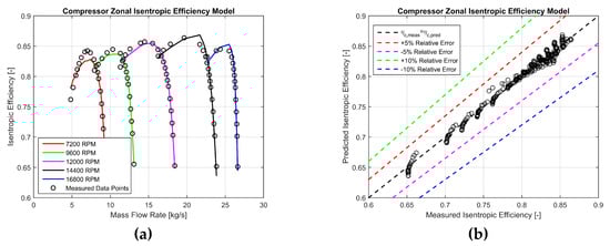 By applying Equations (22)–(24) with the model parameters calibrated by using Least Square Method (LSM), the actual specific enthalpy change can be calculated under the given rotational speed and mass flow rate condition. On the other hand, the specific enthalpy change under the ideal isentropic process can be derived by Equation (25). Subsequently, the compressor isentropic efficiency can be calculated according to its definition ().