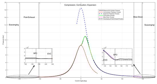 For practical applications that have high requirement on both predictive accuracy and running speed, the MVEM seems to be the best choice. However, due to the absence of a detailed mathematical description of in-cylinder working process, the in-cylinder pressure trace cannot be predicted with MVEM, which limits its practical value to some extent. This is the reason why 0-D model was incorporated into the MVEM in several studies [,]. However, it should be noted that even limited 0-D modeling will increase the model complexity and thus affect the running speed of the MVEM obviously. To solve this problem, the cylinder pressure analytic model proposed by Eriksson and Andersson for the four-stroke SI (spark ignition) engine was modified and adapted to the 7S80ME-C9.2 marine two-stroke diesel engine in this paper []. By coupling the cylinder pressure analytic model to the MVEM, the MVEM is able to estimate the in-cylinder pressure trace. Furthermore, as the running speed of the cylinder pressure analytic model is much faster than the 0-D model, the merit of the MVEM in running speed is not affected significantly.