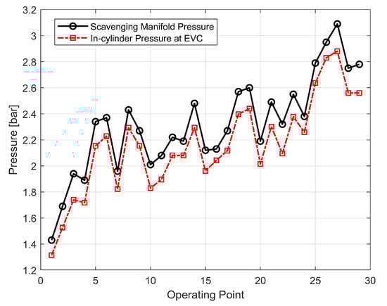 In this section, the in-cylinder pressure trace simulated by the analytic model under four different operating conditions are compared with the measured ones to validate its correctness as shown in Figure 20. It can be observed from this figure that the simulation results agree well with the measured results and can capture the variation trend of in-cylinder pressure trace with crank angle during each working phase. During the gas exchange phase (blow-down, scavenging and post-exhaust), the relative errors of the simulation results are relatively higher than the other phases, which is mainly caused by the simplifications and assumptions made for these phases, i.e., two simple linear functions are adopted to approximate the in-cylinder pressure trace; however, it should be noted that the absolute errors during the gas exchange phase are less than 0.15 bar, which is still satisfactory with respect to the variation range of in-cylinder pressure during the whole working cycle. During the combustion phase, the relative errors of most of the simulation results are less than 5%, which is mainly benefiting from the effective calibration of Wiebe function model parameters as introduced in Section 4.2.3. It should be noted that by superposing more single Wiebe functions, the simulation accuracy during the combustion phase will improve, but this will make the Wiebe function model parameters calibration process laborious. Actually, the current simulation accuracy is already satisfactory to some extent. At the start of compression phase, the relative errors of part of the simulation results approach 20%, which is maybe attributed to two reasons: (1) the absolute value of in-cylinder pressure is relatively lower and small absolute errors will lead to obvious relative errors; (2) the actual compression process is approximated by a polytropic process. Note that as part of the input variables of the analytic model are from the MVEM, thus the predictive errors of MVEM will transform to the analytic model and lead to predictive errors.
