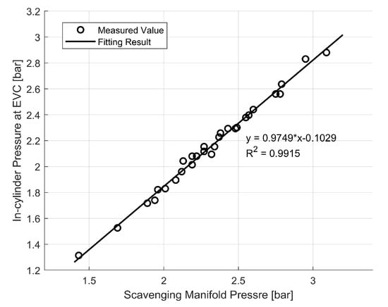 As the exhaust valve lifting curve is not provided by the engine manufacturer and the orifice flow coefficient is also unknown, therefore, the product of and (), is treated as a calibration parameter in this paper. can be approximated as a linear function of the brake power, that is .