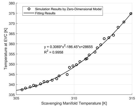 Auxiliary blower of the centrifugal type, which is driven by an induction motor running at fixed rotational speed, is commonly adopted for marine large scale two-stroke diesel engines. Consequently, the auxiliary blower can be modeled as a centrifugal compressor that runs at fixed rotational speed. Following this idea, the pressure increase across the blower and blower efficiency thus only depend on the air volume flow rate . Therefore, and are fitted as a second and third order polynomial of , respectively, based on the auxiliary blower performance map in this paper. Having obtained and , the air temperature exiting the blower can be computed by using Equation (6), which is originally used to calculate the air temperature existing the compressor.