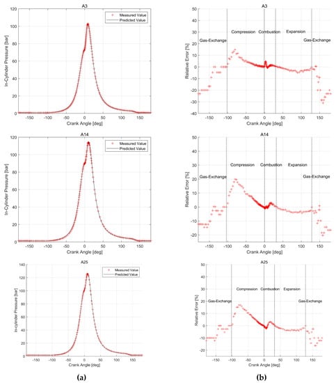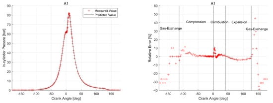 For practical engineering practice, the marine engineers normally judge the engine’s operation status by checking the compression pressure , maximum pressure and its crank angle position . Table 5 compares the predicted and measured results of , and . As can be observed from this table, the cylinder pressure analytic model is capable of predicting and satisfactorily with relative errors less than 1%. Although the relative errors of are relatively higher, the absolute errors are generally less than one crank angle, indicating that the predictive accuracy can be accepted to some extent.