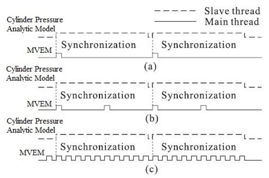 Synchronization approach for the MVEM and the cylinder pressure analytic model: (a) X = 0; (b) X = 1; (c) the calculation frequency of the MVEM is many times the analytic model.