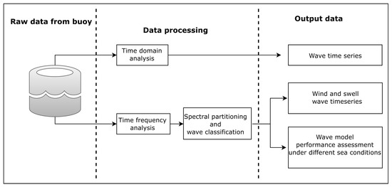 The procedure, illustrated in Figure 1, has been applied to the buoy observed dataset. After a preliminary processing of the raw data, a spectral partitioning was carried out using different methods in order to determine the best spectral splitting technique under such wave conditions. Then, the observed sea states were classified as swell and wind waves.