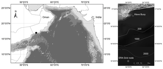 The aim of the present work is to assess the ECMWF ERA5 Re-Analysis dataset’s performance in a coastal region where wind and swell waves are both present. ERA5 is the latest global atmospheric reanalysis, and in the next few years the dataset will cover the period from 1950 to near real time [23]. ERA5 wave data have been compared to an observed wave dataset collected within the frame of a coastal experimental campaign carried out offshore of the Oman coast in the western Arabian Sea, where the wave climate is swell dominated (Figure 1).