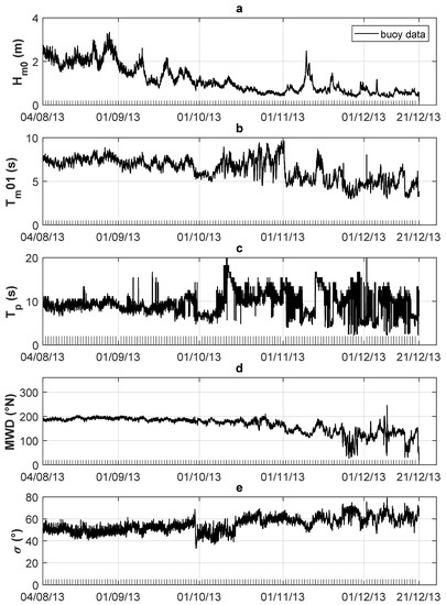 Half-hourly raw elevation data (heave, pitch and roll) have been analyzed and directional and frequency spectra have been obtained. Frequency spectra have been obtained by means of standard Fast Fourier Transform (FFT) to heave time series. Significant wave height () and mean wave period () have been computed from 1D spectral moments and peak period () as the inverse of the spectral peak frequency. Directional wave spectra have been computed through Maximum Likelihood Method (MLM) [36] with a resolution of 0.005 Hz in frequency and 3.6 in direction. Mean wave direction (MWD) and directional spread (), which can be seen as the mean and standard deviation of the directional distribution function, respectively, have been estimated by using the method proposed by [37].