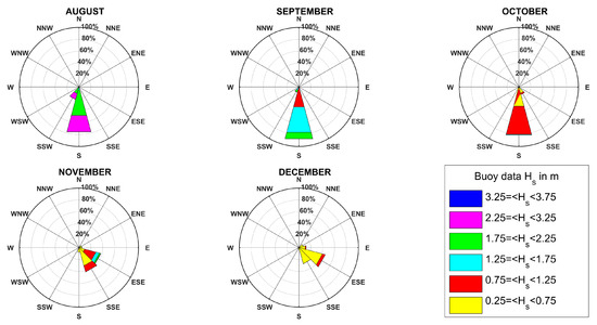 Series of significant wave height (), peak wave period (), mean wave period (), mean wave direction (MWD) and directional spread parameter () have been obtained over 30-min intervals (Figure 3). and the distribution of the percentage frequency of wave direction and height has been analyzed for different months (Figure 4). The buoy was exposed to waves approaching from 55 to 235. As highlighted by [56], the SW monsoon in 2013 presented some peculiarities—a very fast onset and a slower withdrawal phase that lasted from early September until the third week of October. This pattern can be detected in the recorded wave time series from offshore southern Oman. There is a clear distinction between the SW monsoon period (August), characterized by the highest waves coming almost exclusively from the south, and the post-monsoon period (from November to December), characterized by waves coming from east-southeast (ESE) and south-southeast (SSE). In that period, NE monsoon wind waves coexist with long-traveled southern swells, and these two wave systems result in a wave field with MWD tending to SE. The months of September and October 2013 can be seen as a transitional period with low waves coming from S. In August, about 60% of significant wave heights are between 2.25 m and the 3.25 m, while the remaining 40% are within the range 1.75 m and 2.25 m. In September, the direction from which the 92% of the waves come from is south. Waves from SSW constitute the remaining 8%. The wave height values, in this month, are always lower than 2.25 m. Significant wave height values (Figure 3a) decrease from the monsoon period to the post-monsoon period (usually below 1.5 m). The only significant sea storm in the post monsoon was generated by the 2013 Somalia cyclone that severely affected the Oman coast on November.