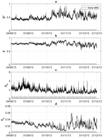 Time series plot of spectral narrowness parameter (a), spectral width parameter (b), spectral peakedness (c) and significant wave steepness (d).