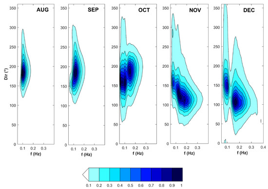 The average monthly directional spectra have been obtained by averaging semi-hourly recorded spectra. To obtain normalized spectral energy value, energy density corresponding to a given frequency has been compared to the peak energy density. Looking at the temporal variability from August to December, it can be noted that the monthly averaged spectrum tends to flatten going from the monsoon period to the post-monsoon evolving from an almost unimodal shape in August to spectra with very low energy density and multiple peaks during post-monsoon (Figure 7). This is consistent with [30]; they observed the same behavior along the western Indian coast. In August average monthly directional spectra have the highest spectral density with a peak period at 0.1 Hz and wave direction at about 180. In September, frequency bands are significantly wider than in August and the wave direction varies between 100 and 300. In October, multipeaked spectra appear and three different wave systems can be detected: a long period swell (frequency 0.06 Hz), an intermediate period swell (frequency 0.1 Hz) and a wind generated wave (frequency 0.15 Hz). During November and December, the NE monsoon wind generated waves (between NE and E) coexist with the distant swells from the south Indian Ocean (from south). Moreover, in November, long period swells coming from south with peak frequency of about 0.06 Hz can be detected. The monthly variability in the spectral energy distribution seems to be similar to that found along the western Indian coast [30].