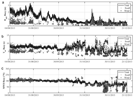 Time series plot of wave characteristics estimated from partitioned spectra: significant wave height, wind wave and swell height (a); mean wave period, wind wave and swell mean wave period (b); and mean wave direction, wind wave and swell mean wave direction (c).