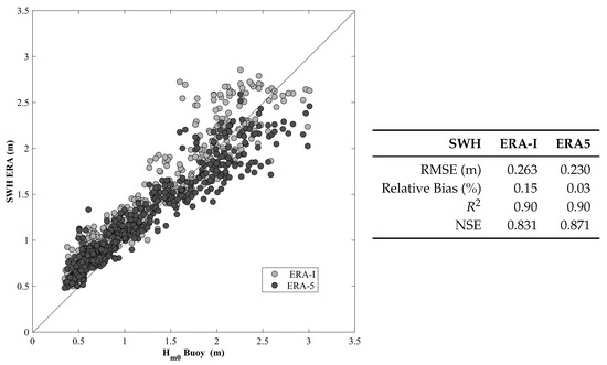 A statistical comparison of observations and forecasts using ERA5 and ERA-I wave models highlights that the ERA5 wave model has a better performance for wave heights estimation (Figure 9). Mean error, standard deviation and root mean square error (RMSE), relative bias and coefficient of determination () have been estimated for the numerical datasets, and results have shown an RMSE of 0.23 m for ERA5, lower than RMSE estimated for ERA-I data (0.26 m).