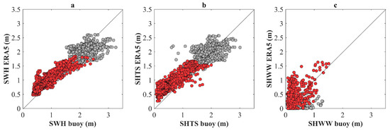 Scatter plot of the synchronous wave heights extracted from ERA5 wave models against the back-propagated observed wave heights at the nearest ERA grid node: (a) observed SWH vs. ERA5 SWH; (b) observed SHTS vs. ERA5 SHTS; (c) observed SHWW vs. ERA5 SHWW. Red dots represent wave heights in the post-monsoon season (October, November and December).
