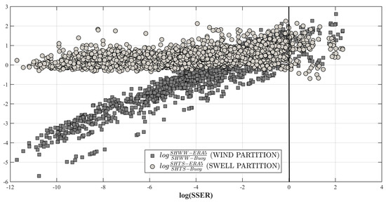 Moreover, the performance of the model was analyzed according to the value of wind wave–swell energy ratio SSER [59] (Figure 11). If SSER ≫ 1, the sea states are classified as wind waves. Waves are identified as swells if SSER≪ 1. For other cases a mixed sea state is present.
