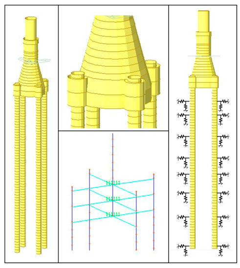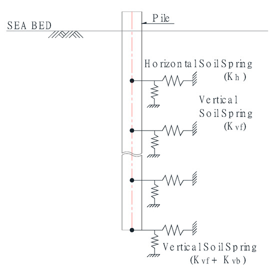 Assuming that the concrete sleeves and piles are sufficiently composited with a length of 4 m, the rigidity of the concrete foundation itself is high. Therefore, as shown in Figure 5, the concrete foundation element and the concrete sleeve element are connected using a rigid link. To apply the behavior of the pile according to the soil conditions, the soil is modeled as an elastic foundation, and the horizontal and vertical elastic springs are applied to the pile. For the pile, a reverse circulation drill (RCD) pile with a diameter of 2 m, which is used for marine construction, is applied. The soil where the PCF structure is located is composed of sandy soil and weathered soil up to a depth of 60 m, as shown in Table 2, therefore piles were penetrated to the weathered soil layer to achieve the end bearing capacity of the pile. Thus, the total length of the pile was 60 m, and the diameter and thickness were 1.8 m and 0.05 m, respectively. A 1-m deep pile was modeled as a frame element, and a total of 60 frame elements were used to model the pile, with horizontal and vertical elastic springs applied to the center of each pile. The spring stiffnesses were calculated according to the soil conditions in Section 2.2 and Equations (7)–(9), and the vertical and spring stiffness for each layer are shown in Table 5.