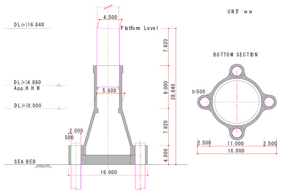 The PCF structure to support a 3-MW wind turbine was determined for the offshore conditions of the coast near Jaeun island in Jeollanam-do of Korea. The dimensions and material properties of the PCF structure are presented in Figure 2 and Table 1, respectively. The thickness of the steel shaft is 40 mm, including corrosion thickness, and the outer diameter of the shaft to be connected to the tower of the 3-MW wind turbine is 4.5 m. The diameter of the concrete foundation is 6.0 m, the outer diameter of the shaft is 4.5 m, and the thickness is 0.75 m. The diameter of the bottom of the concrete foundation is 11 m, excluding the concrete sleeve, which is 1.0-m thick. For the pile, which has a 2.0-m diameter, the concrete-sleeve has a 3.0-m diameter and 0.5-m thickness. To determine the heights of the shaft and concrete structure, the datum level (DL), mean higher high water level (MHHW), and maximum wave height are considered. MHHW is DL (+) 4.86 m and maximum wave height is DL (+) 12.64 m. Thus, the heights of the shaft and concrete structure are DL (+) 16.82 m and DL (+) 9.0 m, respectively, to install the steel platform above the maximum wave height of DL (+) 12.46 m. Construction cost per 1 MW turbine capacity of PCF was calculated based on the dimensions of the structure and construction site and was compared to the cost of the jacket structure calculated using the same site conditions. The cost of manufacturing and construction of 10 PCF structures are calculated as 4.47 and 23.89 billion KRW respectively, and construction cost per 1 PCF was 2.84 billion KRW. Therefore, construction costs per 1 MW of PCF structure is 0.945 billion KRW and this is indicated a cost difference of approximately 7% when comparing with the cost of jacket 1.013 billion KRW.