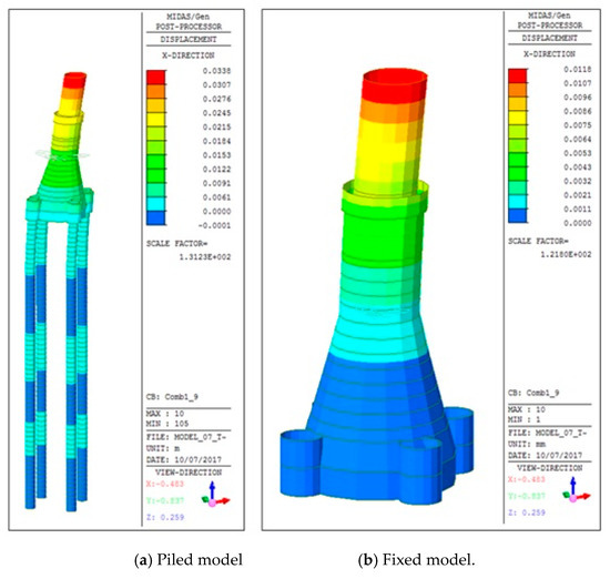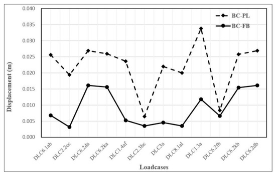 The support structure is subjected to horizontal loads due to turbine and environmental loads, therefore the maximum displacement occurs in the horizontal direction. To evaluate the influence of the use of piles on the PCF structure, the horizontal displacement of the piled foundation model (BC-PL model) was compared to that of the model using the fixed boundary condition instead of the pile (BC-FB model). The maximum horizontal displacements of the two models according to the load case are shown in Figure 6, and the deformed shapes are shown in Figure 7.