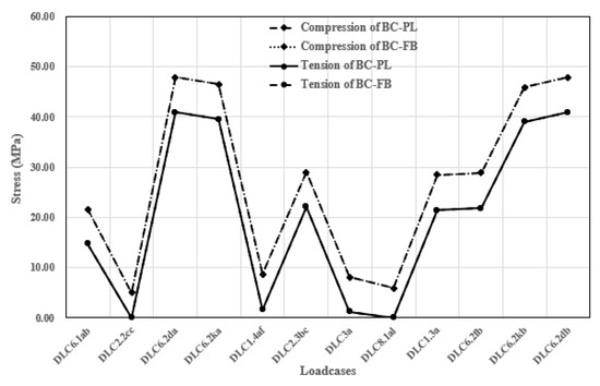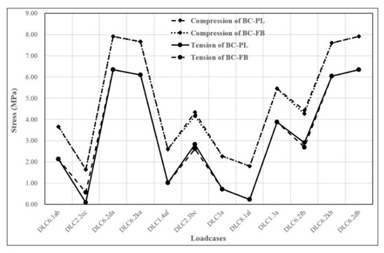 In order to evaluate whether the PCF structure is safe under the turbine load and environmental load, the generated stress and the displacement were evaluated. The stresses that occurred in the shaft, which is steel, are as shown in Figure 8, and the stresses of the BC-FB model and the BC-PL model were compared. The stresses in the two models were almost the same, and the maximum compressive stress and the maximum tensile stress were −47.900 MPa and 40.900 MPa in DLC6.2da, respectively. Stress distribution on the shaft is shown in Figure 9, and maximum stress was found at the center of the shaft. The allowable stress of the steel can be used as the allowable stress of SM400 steel of 185 MPa as proposed by the Harbor and Fishery design criteria [22], and the material factor γ m for tubular structures is 1.1 according to DNV-OS-J101. The steel shaft is safe because the maximum stress of −47.900 MPa does not exceed the allowable stress.