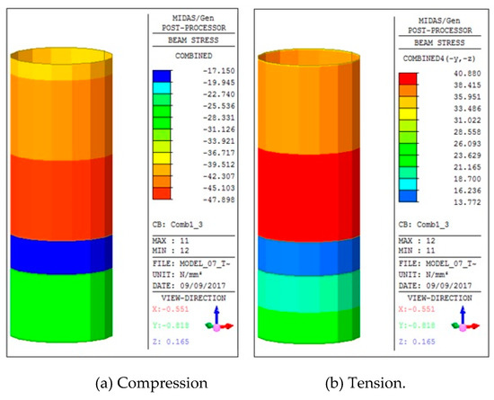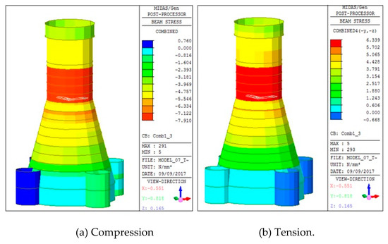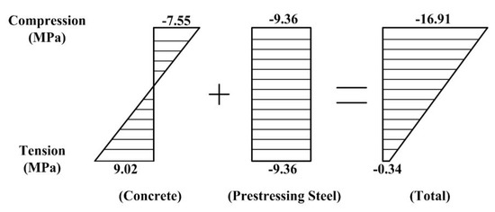 To apply the effect of prestressing steel to concrete, prestressing force and effective stress have to be calculated based on the prestressing strand and the number of tendons. For prestressing force, 72% of the ultimate strength, 1368 MPa, was used. From this strength, the prestressing force of one strand can be calculated by multiplying 1368 MPa by the nominal cross-sectional area 138.700 mm2, and the prestressing force of one tendon is the sum of the prestressing force of 19 strands. For the effective stress, 20% loss of prestressing was applied. Calculation procedure and values of the prestressing force are presented in Table 7. The calculated effective stress by prestressing steel was 9.36 MPa, as presented in Table 7. With this value, total stresses on the structure after applying the prestressing steel could be calculated, and these stresses were evaluated by comparing it with the allowable stresses. From the quasi-static analysis, maximum tensile and compressive stress were 9.026 MPa and −7.55 MPa, respectively. Thus, the total stresses could be calculated, as presented in Figure 14, and it is noted that the maximum tensile stress was changed to compressive stress because an effective stress of −9.36 MPa was bigger than the occurred stress of 9.02 MPa. Consequently, it is determined that the total stresses on the structure are safe enough by applying prestressing steel.