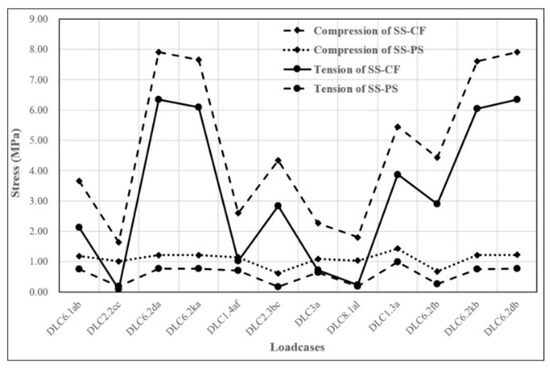 As in the case of displacement, the generated stresses for the pile model are compared to those of the model using fixed boundary conditions, and the maximum stresses according to each load case are shown in Figure 10. The stresses in the two models show that the same stresses occur in each load case, except for the tensile stress of DLC2.2cc and DLC6.2fb. The maximum tensile stress of DLC2.2cc occurred in the concrete sleeve part, and it was found that the maximum tensile stress occurred differently depending on whether the pile was used. Therefore, it is necessary to model and analyze the structure with pile modeling for the stress check. Since the maximum tensile stress occurs in some load cases, further study about the concrete-sleeve is needed through a detailed analysis. The maximum compressive and tensile stresses in the PCF structure occurred in the case of DLC6.2da, and the values were −7.910 MPa and 6.340 MPa, respectively. The stress distribution for this load case is shown in Figure 11. It can be seen that the maximum stress occurs at the part where the concrete cone and the cylinder shape are connected (tapered section). Except for DLC2.2cc, the maximum stress occurred at the same part, and for DLC2.2cc, the maximum tensile stress occurred at the concrete sleeve.