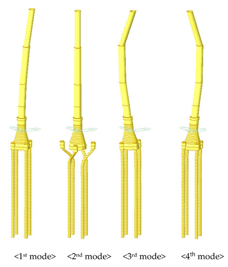 To evaluate the dynamic response and stability of the PCF structure, natural frequency analysis was carried out. To account for the entire model of the structure, the tower was modeled as shown in Figure 15, and the turbine above the tower was applied as an additional mass. The properties of tower and turbine are presented in Table 3. The pile for the PCF structure can be considered as a steel pile or RCD pile, and the results of the three models (i.e., PL-ST, PL-RCD and BC-FB models) are compared to evaluate the effects of pile type and boundary conditions. The evaluation of the natural frequency was carried out using the natural frequency design range of the support structure, which has the 3-MW class turbine in Figure 16. The second and third modes rarely occur in a real structure, therefore the evaluation of first natural frequency is most important.