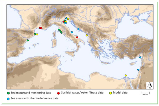 All data on MP contamination in river environments from different studies on Mediterranean tributaries are reported in Table 1. The data available are graphically reported in Figure 1.