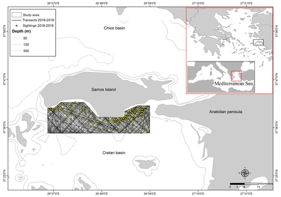 The study area is located to the south of Samos Island (Greece) covering an area of approximately 351 km2, on a shallow plateau with depths that rarely exceed 100 m (Figure 1). The surrounding area is characterized by a steep valley formation reaching approximately 1500m in depth. A small-scale artisanal fishery is active in the area. Trammel and gill-netters, bottom trawlers, and long-liners are distributed in several fishing harbors along the coast of Samos and neighboring islands [41,42,43,44]. Marked shipping traffic providing underwater noise affects the area, and floating plastic debris has been increasingly recorded, probably due to the presence of different marine thoroughfares from the Dardanelles Straits towards Athens, the Suez Canal (via the Dodecanese Archipelago), and Turkey/Cyprus via Rhodes [44].