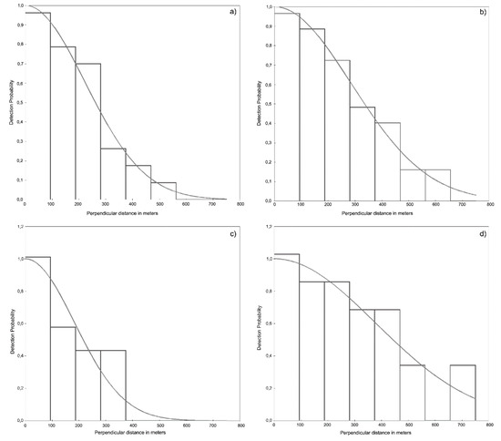 Detection functions modelled for D. delphis in (a) 2016, (b) 2017, (c) 2018, and (d) 2019.