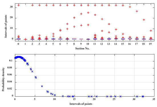 A body plan (KCS) of 20 slices is selected to further illustrate the non-uniform feature inherited from the stereolithographic model. For each slice, the distance interval in space between two adjacent points is calculated. The statistical characteristics of these intervals are presented in Figure 5. The top figure in Figure 5 is the boxplot of the intervals. In each box, the central red line mark indicates the median, and the bottom and top edges of the blue box indicate the 25th and 75th percentiles, respectively. The whiskers extend to the most extreme data points not considered outliers, and the outliers are plotted individually using the red “+” symbol. In addition, the standard normal distribution is utilized to evaluate the non-uniform feature of the intervals. The probability density function f(x) is calculated based on the mean value μ and the standard deviation σ as in Equation (1), where the sample data X refer to the intervals. The f(x) of the intervals is provided in the bottom figure of Figure 5, where the dimension of the horizontal axis could be in centimeters or meters, depending on the stereolithographic model.