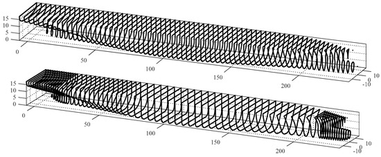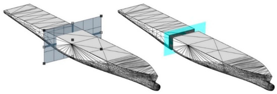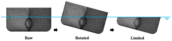 In the time-domain strip method, the instantaneous wetted surface is calculated at each time step [19]. Particularly, the wetted surface varies during the six degrees of freedom (6-DOF) motions of a ship. The dense body plan under arbitrary roll and pitch angles can be conveniently produced by rotating the stereolithographic model. Based on the incident wave elevation around the ship, an instantaneous wetted surface could be integrated by limiting the body plan with the elevation in each longitudinal location. The slicing process of the rotated model is presented in Figure 8. Although the instantaneous free surface in the time-domain calculation is fully non-linear, an average steady water plane is adopted here to illustrate the effectiveness. The present method shows the applied potential in time-domain strip theory.