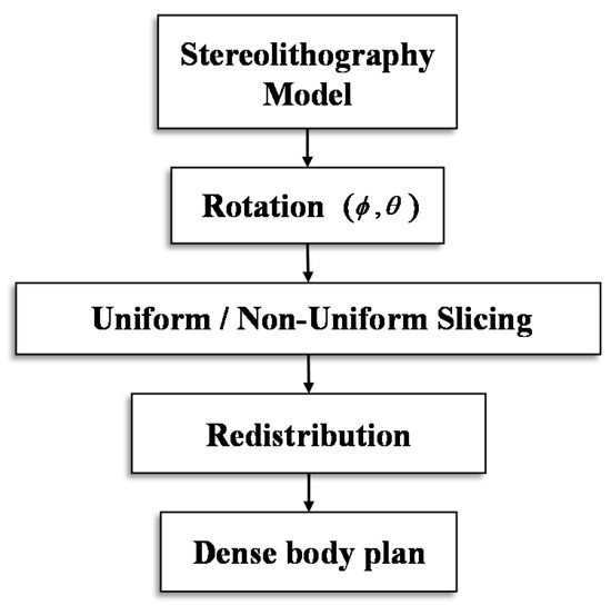 The set of cutting planes is prepared at the beginning of the slicing pipeline. The constant layer thickness along the slicing direction is adopted in uniform slicing and non-uniform slice planes and can be easily produced by a density distribution function or adaptive method based on surface curvature. Examples based on both uniform and non-uniform slicing are provided in Figure 7.