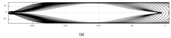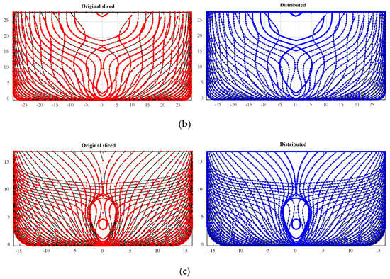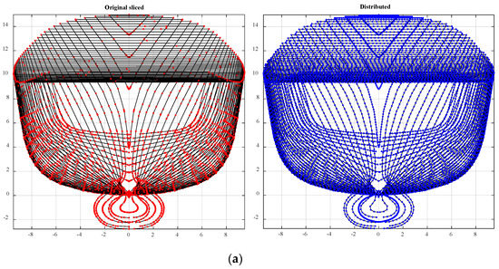 The produced body plans are shown in the following figures based on the present method. Initially, the data of the models under a rolling and pitching angle are presented in Figure 11. The sliced data along the transverse and vertical directions are provided in Figure 12. Besides, the body plans under different slices are given in Figure 13. Finally, the original sliced data are compared with the redistributed data in Figure 14.