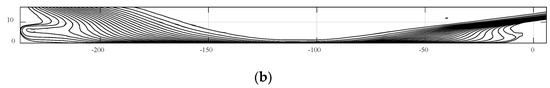 (a) Body plan under rolling (KCS, roll angle: 15°, 70 slices). (b) Body plan under pitching (KCS, pitch angle: 2°, 50 slices).