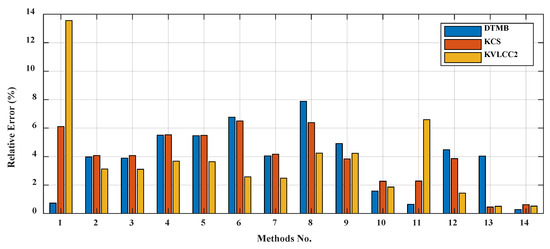 Figure 15 illustrates the relative error of each WSA compared with the published value. The results show that the traditional methods have difficulties covering all the ship types. Note that the estimation methods (1–12) of WSA are mostly based on the regression analysis from a group of ships, or the approximate calculation using simplified ship geometries. Thus, the estimation approaches have limited accuracy, especially across the diversity of possible vessel types. However, the relative error of DTMB at 20 slices is greater than the other two ships, which demonstrates the limitation of a body plan at a small number of slices. The accuracy and adaptability based on the dense body plan of 200 slices are higher than all the estimation methods. Moreover, the present method could handle the ships equipped with special underwater appendages such as a bulbous bow.