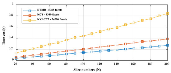 The computational cost is another vital factor for evaluating this method. The number of facets varies according to the size of stereolithographic models, which leads to different time costs. Time costs of the three models are provided in Figure 16. The time cost is linearly increased from 20 slices to 200 slices in each model. For the KVLCC2 model, which has 24,586 facets, it takes 0.841 s to generate the 200 slice body plan. At present, the computation is based on CPU implementation and has not been processed in parallel. The experimental condition uses an Intel I7-8750H CPU (2.20 GHz) and 16 G RAM.