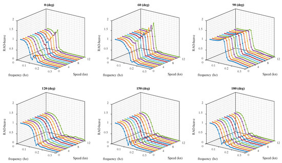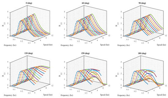 The hydrodynamic coefficients are organized by ship speed, wave frequency and wave encounter angle in the database. Part of the coefficients in the database are provided in Figure 18, Figure 19, Figure 20 and Figure 21. The added mass, damping coefficients, motion RAOs and wave load RAOs are matrix values in the database. The ship speed varies from 0 to 12 knots, and the wave encounter angle varies from 0° to 180°. The frequency interval is 0–0.3 Hz.