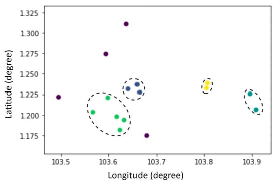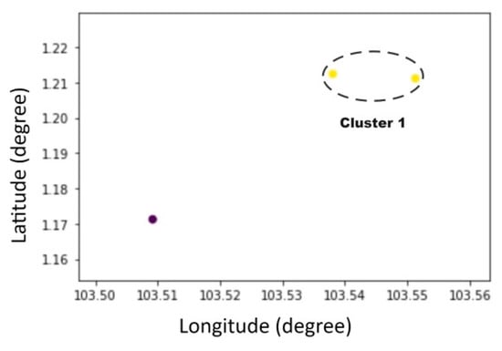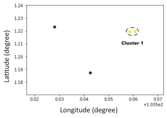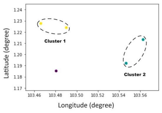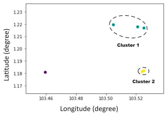 Clustering belongs to an unsupervised learning method and is a branch of data mining. So far, many clustering algorithms have been proposed [32,33,34,35,36,37], such as K-Means clustering [32] and DBSCAN [34]. Among them, the DBSCAN algorithm is a density clustering method proposed by Ester [34], as a classic density-based clustering algorithm, the main idea of the DBSCAN algorithm is to cluster a given set of objects in space, group densely distributed points into a clustering cluster, and leave the remaining sparse individual points apart marked as noise points. The DBSCAN algorithm can identify noise among cluster objects, find clusters of any shape and size that reaches the target density. The clustering results of DBSCAN algorithm are relatively more accurate when there is no specified number of clustering results, and DBSCAN can find clusters of any shape in the data with noisy points. The DBSCAN algorithm has been widely used in various fields presently, such as medicine, biology [38], analytical chemistry [39], marine transportation [3,4], etc. This study used the DBSCAN clustering algorithm in the process of quantifying the regional collision risk in selected water area, which improved the efficiency and visualization of the quantization process, while reducing the amount of calculation and the complexity of the calculation. After clustering with DBSCAN, several clusters will be obtained in the area as shown in Figure 1.