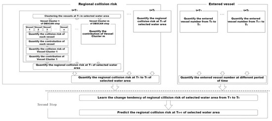 Construct the historical data obtained from Section 2 as a training database for RNN to learn. By calculating the regional collision risk at different time points, the time distribution of regional collision risk in selected water area can be obtained as inputs with the number of entered vessels at different time periods, therefore the RNN is used to predict regional collision risk of selected water area at following subsequent time point. The flow chart of this second-step framework is shown in Figure 5.