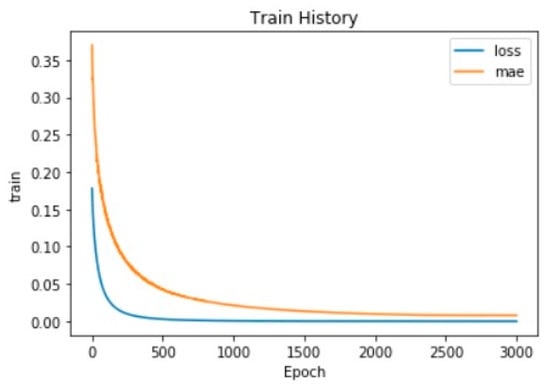 The data set constructed based on the AIS historical data on 4 and 5 January 2014 is shown in Table 6. The RNN prediction framework proposed in this study was trained based on the data set, and the factor weights were gradually modified, set the number of learning times as 3000 rounds and 7000 rounds. The prediction result is shown in Table 7, the training process diagram of RNN is shown in Figure 16 and Figure 17, the parameter mae and parameter loss in each figure have changed from large to small, and have gradually stabilized.