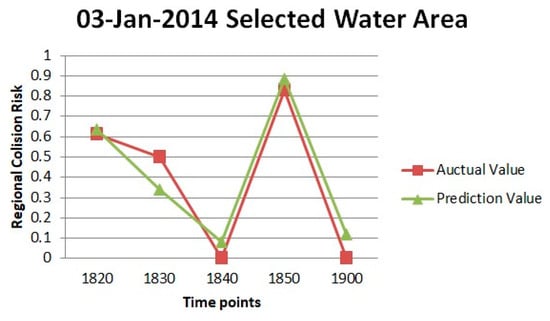 Based on above observation, at 1900 on 3, 4 and 5 January 2014, the prediction results of regional collision risk obtained through the RNN prediction framework is close to the actual value obtained based on AIS historical data. In addition, the prediction results of the prediction framework for the other time points are also closer to the actual values. Comparing the predicted values of regional collision risk with actual historical data, it can be seen from Figure 15, Figure 18 and Figure 19 that the predicted values obtained from RNN prediction framework are close to the actual values of regional collision risk. The change tendency of predicted regional collision risk value and the actual regional collision risk value have reach a good agreement. The results of previous application and validation all shown that the RNN prediction framework proposed in this study can effectively predict the regional collision risk in specific water area.