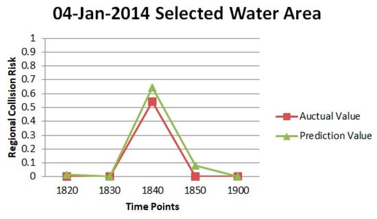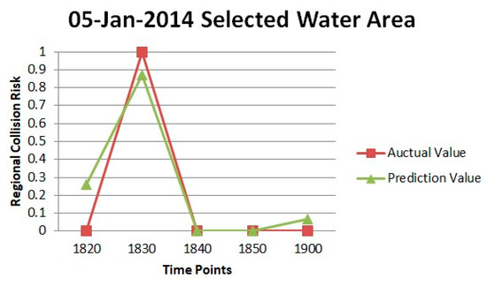 In the next step, the prediction models obtained by this approach was used to predict the regional collision risk at 1900 on 4 and 5 January 2014. The predicted and true values for regional collision risk values are shown in Table 8 and Table 9, and Figure 18 and Figure 19.