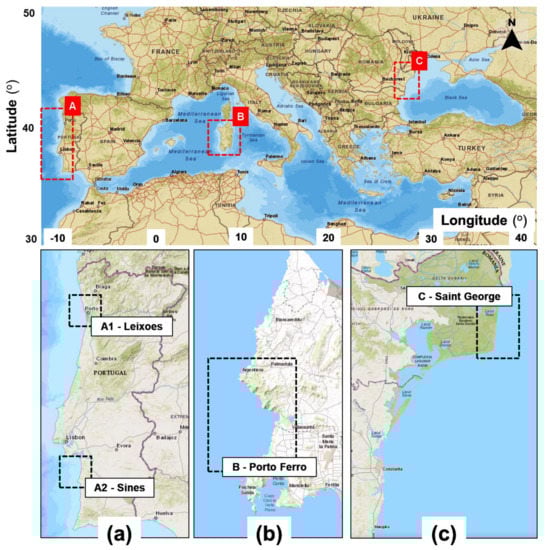 Locations of the target areas considered for assessment, where: (a) Portugal continental (North Atlantic Ocean); (b) Porto Ferro, Sardinia (Mediterranean Sea); (c) Saint George (Black Sea). Figures processed from Google Earth (2019).